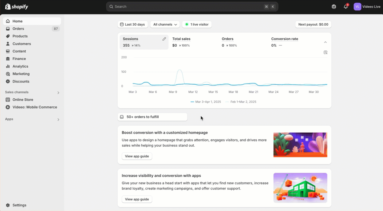 - Navigate to Videeo: Mobile Commerce under the Sales Channel section of your Shopify side menu.