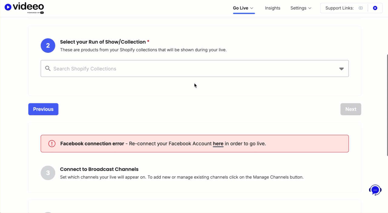 - Step 3 - Connect to Broadcast Channels. Enable the toggle for the channels you wish to go live on.