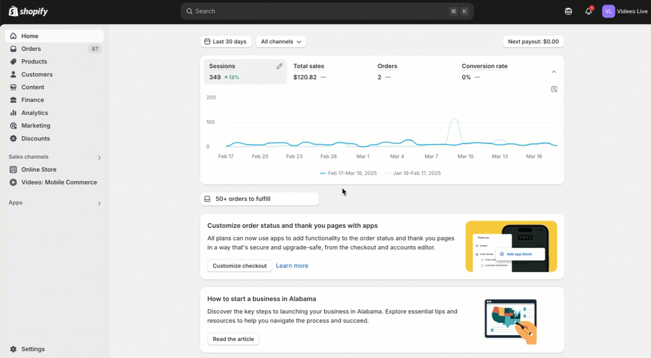 - Select Videeo: Mobile Commerce under the Sales Channel section of your Shopify side menu.